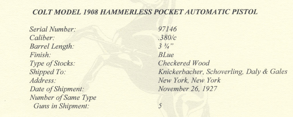 Colt Model 1908 Pocket Hammerless .380 ACP serial number 97146 -Colt factory letter indicates that this pistol was shipped with blue finish and Checkered Wood stocks to Knickerbacher, Schoverling, Daly & Gales, New York, New York, on November 26, 1927 in a 5 gun shipment.