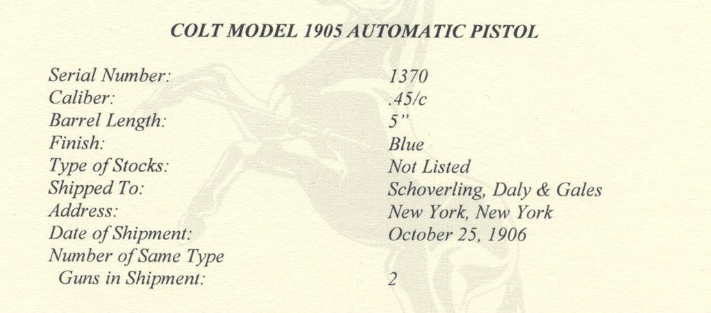 Model 1905 Military .45 Serial Number 1370 - Colt factory letter indicates that this pistol was shipped with a blue finish to Schoverling, Daly & Gales, New York, New York on October 25, 1906 in a two gun shipment. |