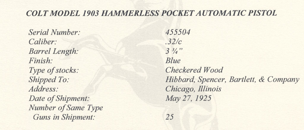 Colt Pocket Hammerless 1903 .32 ACP serial number 455504 (ca. 1924) - Pistol is an early example showing the transition from Type III hard rubber stocks to full checkered walnut with the newly introduced flush medallions. The Colt historical letter confirms that this Colt was shipped with blue finish and checkered wood stocks to Hibbard, Spencer, Bartlett & Company, Chicago, Illinois on May 25, 1925 in shipment if 25 pistols.