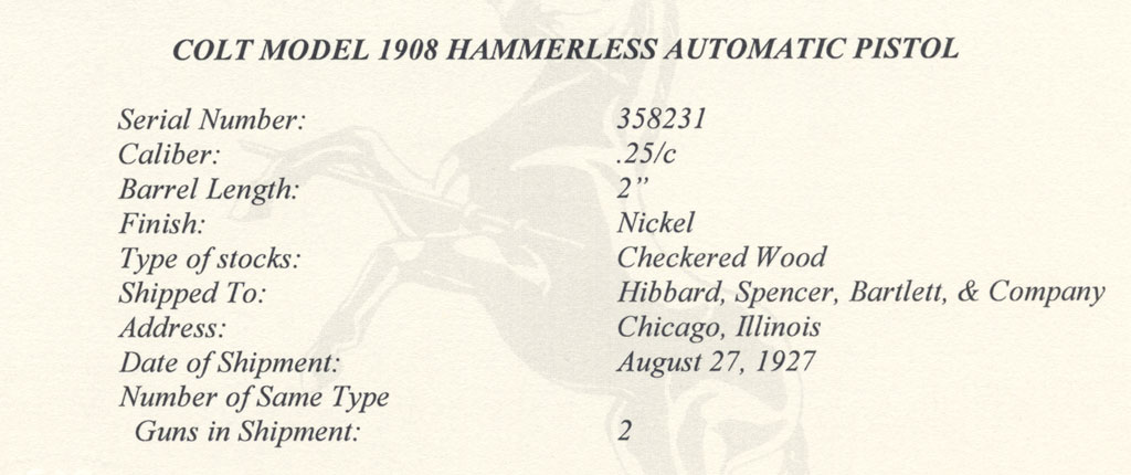 Colt 1908 Vest Pocket .25 ACP serial number 358231 - Colt factory letter confirms the nickel finish and stocks. This pistol was shipped on August 27, 1927 to Hibbard, Spencer, Bartlett & Company in a two gun shipment.