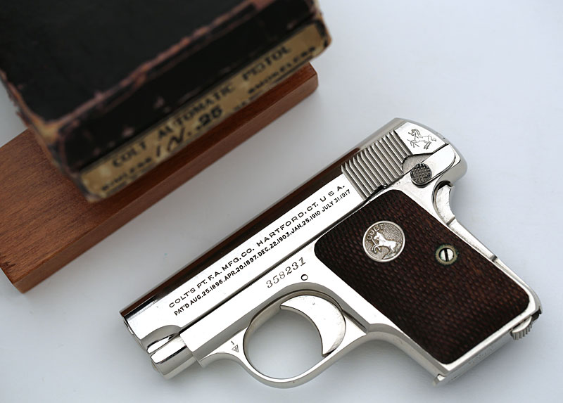 Colt 1908 Vest Pocket .25 ACP serial number 358231 - Pistol has factory nickel plated finish with checkered walnut stocks with flush Colt medallions and is accompanied by the original box numbered to the gun.