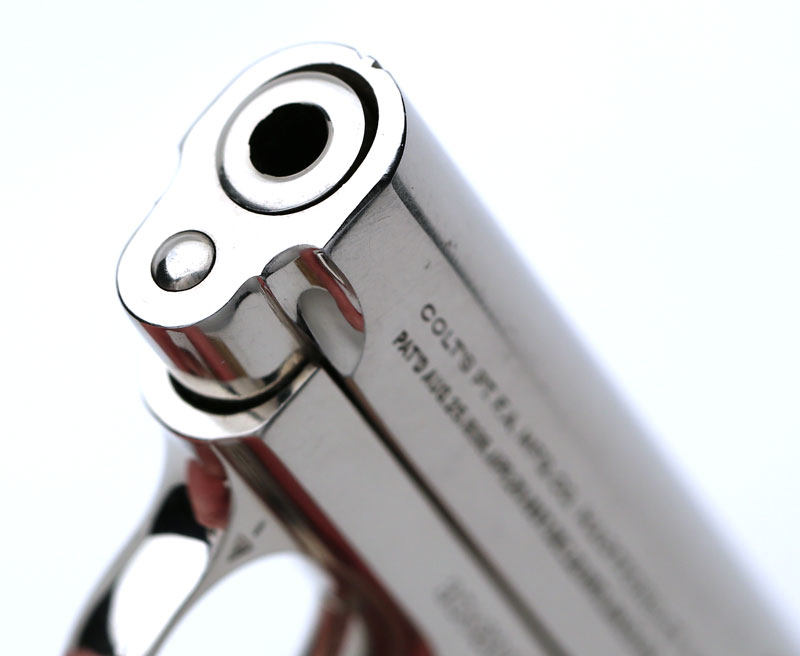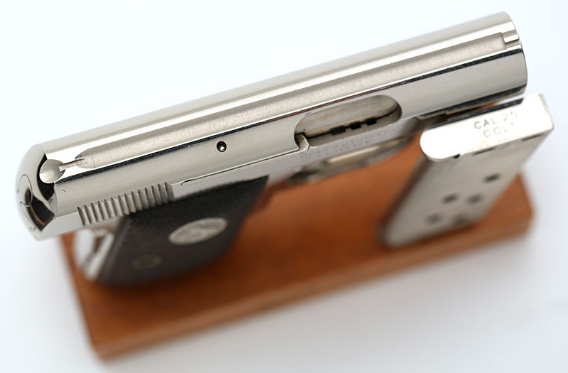 Colt 1908 Vest Pocket .25 ACP serial number 358231 - showing engraving on left top of slide. Original factory box is numbered to the gun and has the white end label with black writing to designate "nickel finish".