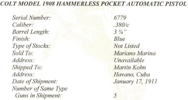 Kohn, Havana, Cuba on January 17, 1911. Pistol was purchased