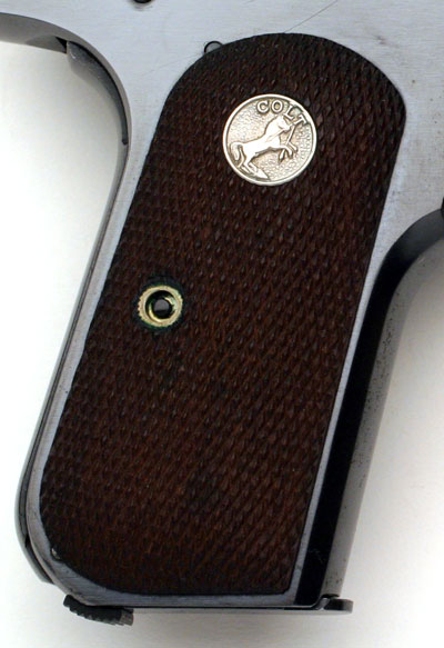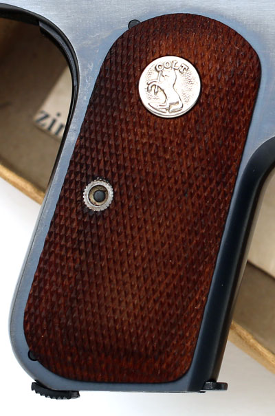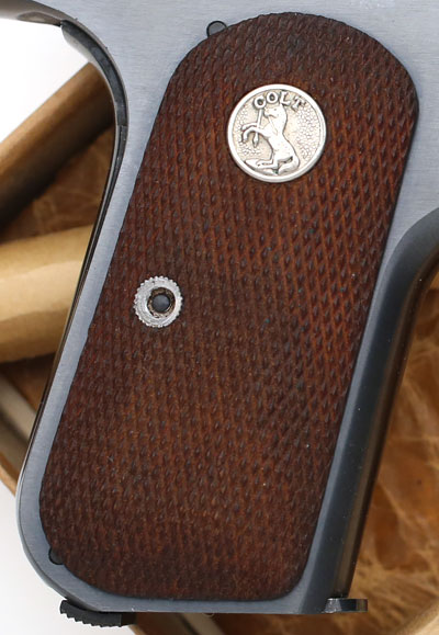 checkered walnut grips with forward facing flush medallion