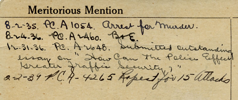 Meritorious Mention - noted on the back of the Record Bureau