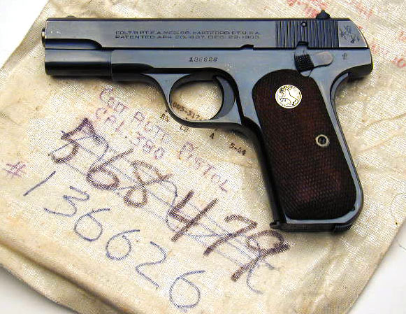 Colt semi-automatic pistol serial number 136626 wrapped in a military