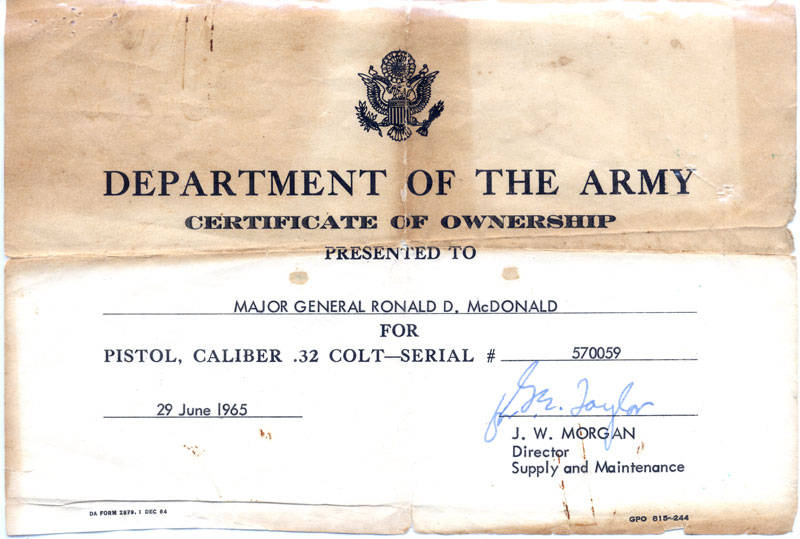 having been issued to Major General Ronald Dana McDonald.