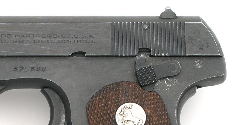 Colt Model 1903 Pocket Hammerless .32 ACP pistol serial number 570548 - Left side close-up of ordnance mark.