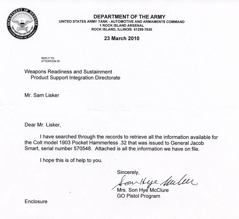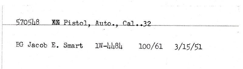 Letter and copy of original index card from Rock Island Arsenal documenting Colt Model 1903 Pocket Hammerless .32 ACP serial number 570548 as having been issued to Brigadier General Jacob E. Smart on March 15, 1951.