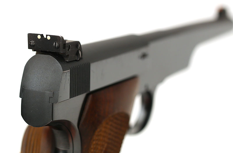 Colt Woodsman Match Target barrel muzzle and front sight.