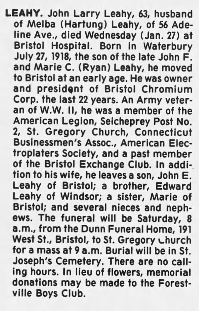 Pistol was a one gun shipment to J.L. Leahy in Bristol, Connecticut on May 6, 1940. J. Lawrence Leahy was born in Waterbury, CT July 27, 1918. He moved to Bristol at an early age and eventually became the owner and president of Bristol Chromium Corporation for 22 years. He served his country and was an Army veteran of WWII.